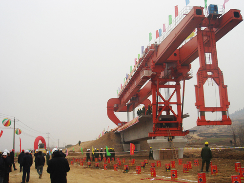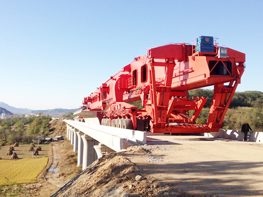 以及生產更新運架產品能架設跨度40M高速鐵路箱梁的:SXJ1000T/40M一跨式架橋機(配套攀爬式運梁車可以實現過隧道零距離架梁)和攀爬式運梁車。並能對現有32M分體式運架設備進行改造,改造後能實現高低位架設跨度40M高速鐵路箱梁(高位改造不能過隧道,把原架橋機改造一跨式,把原運梁車增加2軸。低位改造能過隧道架梁,把原架橋機改造一跨式低位,把原運梁車改成攀爬式運梁車並增加二台喂梁台車實現過隧道架梁)。