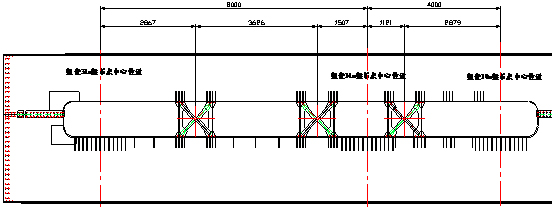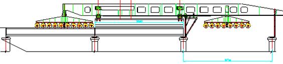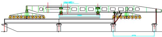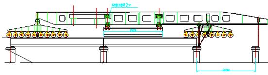 架橋機架完32米梁後,接著架設24米梁時,拆除主梁後起重小車縱移範圍滑道內的支撐架,通過縱移油缸和導杆裝置以倒頂的方式將後起重小車前移8m,恢複主梁內支撐架,其餘架梁作業程序相同。其它跨度的變跨方式同上。不同跨度的支撐架位置及後起重小車位置示意如下。